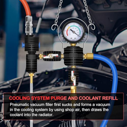 - متعددة الاستعمالات: المجموعة عبارة عن مجموعة أدوات رادياتير شاملة الكل في واحد، تتضمن ادوات كشف التسرب وقياس درجة الحرارة ووظائف تعبئة سائل التبريد. يتم اختبار التسرب باستخدام مضخة يدوية بالضغط على الخزان/الغطاء ومراقبة مؤشر الضغط للتأكد من تسرب النظام بمرور الوقت. آلة تعبئة الفراغ الهوائية تقوم أولاً بتكوين فراغ في نظام التبريد باستخدام هواء الورشة، ثم تقوم بسحب سائل التبريد إلى النظام. إضافة سائل التبريد تحت التفريغ يمنع وجود جيوب هواء كبيرة ويحمي المحرك من التشقق أو التلف الآخر.