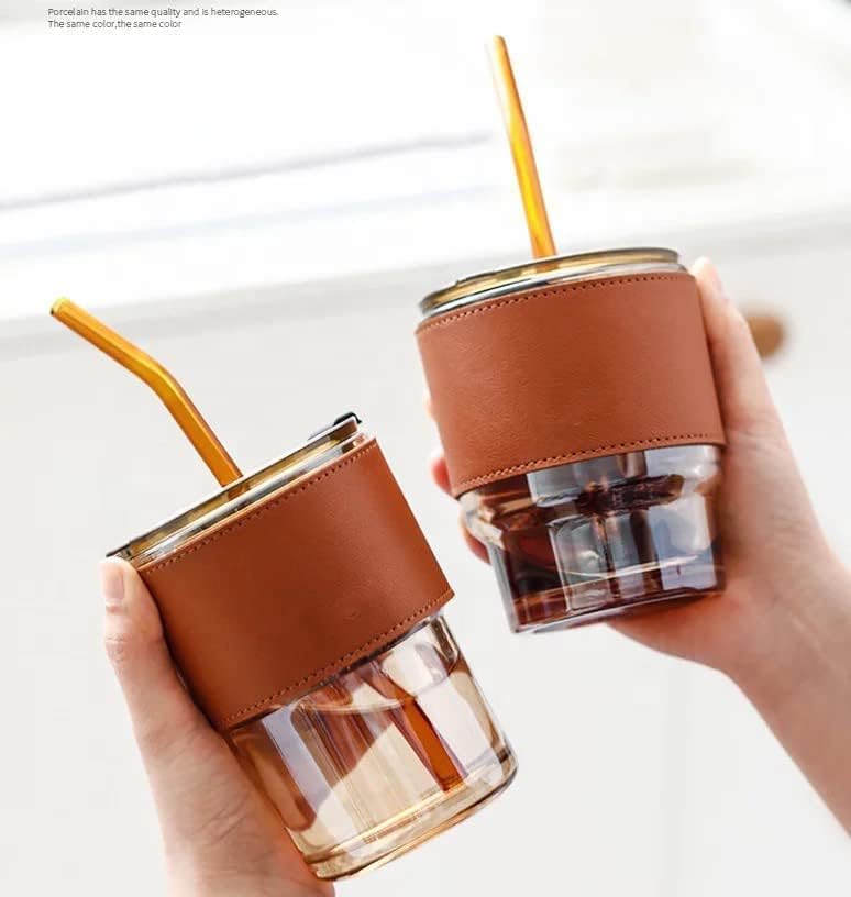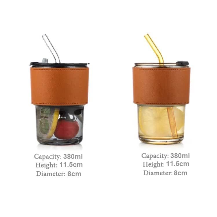 JINU - كوب زجاجي مع غطاء وشفاطة زجاجية بتصميم مزين بشريط أنيق مناسب كمج للقهوة والسموثي واللبن والعصائر وللسفر بسعة 380 مل من جينو (مجموعة من قطعة واحدة)، (رمادي فاتح / بني فاتح)
