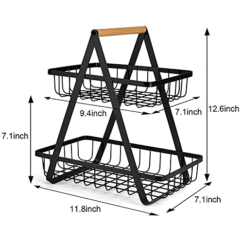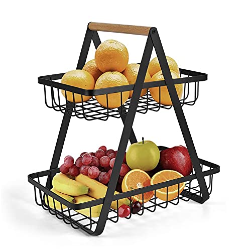 Spaceshoop - سلة فواكهة بدورين، منظم لرف المطبخ والسفرة، قابل للفصل، حامل لتخزين الخضروات والفاكهة (اللون: اسود)، معدن