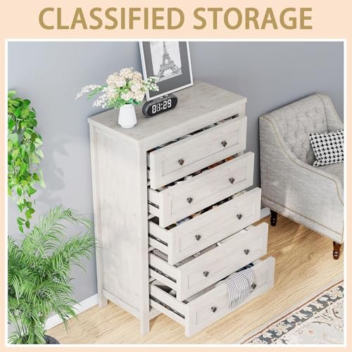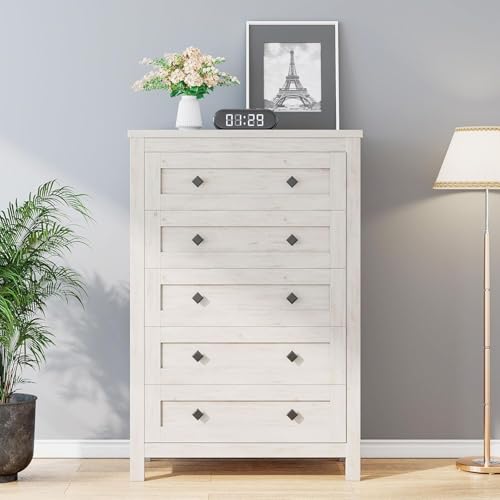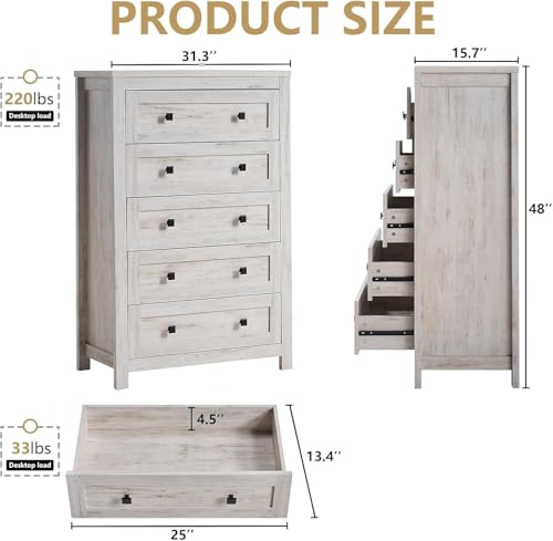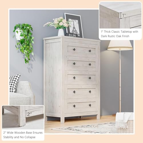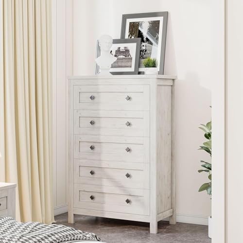 - تصميم متين وتصميم بيت المزرعة: خزانة خشبية ريفية ذات 5 أدراج مع إحساس كامل بالثقل وتجمع بشكل مثالي بين الطراز الحديث والمزرعة، مما يضيف الأناقة والسحر إلى غرفة نومك أو غرفة المعيشة