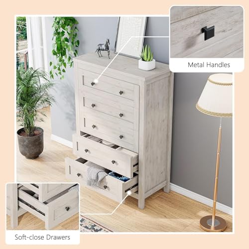Jocisland - خزانة ذات 5 ادراج من جوسيلاند، خزانة ادراج خشبية ريفية، منظم خزائن طويل بمقابض معدنية، خزانة ذات 5 ادراج للرواق وغرفة المعيشة والمدخل، لون ابيض ريفي