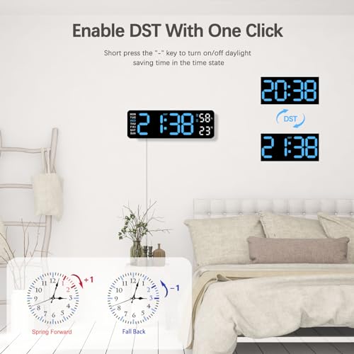 - < ضبط التوقيت الصيفي الآلي ونظام الساعات 12/24> تتيح ساعة الجدار العصرية إمكانية التبديل بين عرض الوقت بنظام 12 ساعة أو 24 ساعة، لتمكنك من اختيار التنسيق الذي تفضله حسب اعتيادك. في حال استخدام التوقيت الصيفي في بلدك، يمكنك تفعيل هذا الخيار لتقوم الساعة بتحديث الوقت آلياً بناءً على التاريخ.