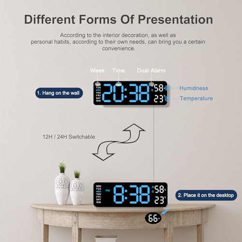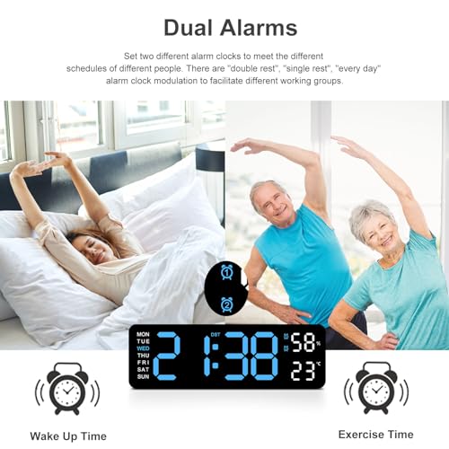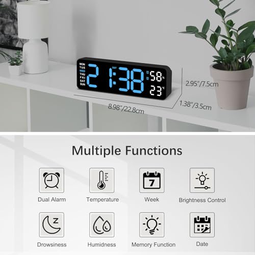 JoFomp - ساعة إلكترونية جدارية بعرض ضخم، ساعة ليد جدارية لتزيين الصالون توفر قياس الحرارة والرطوبة وميزة الإضاءة الذكية والمنبه بنظامي 12 و24 ساعة، هادئة ومناسبة للصغار والكبار من جو فومب، 23 سم