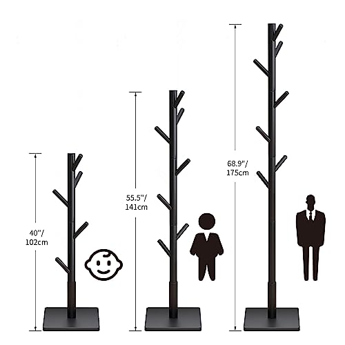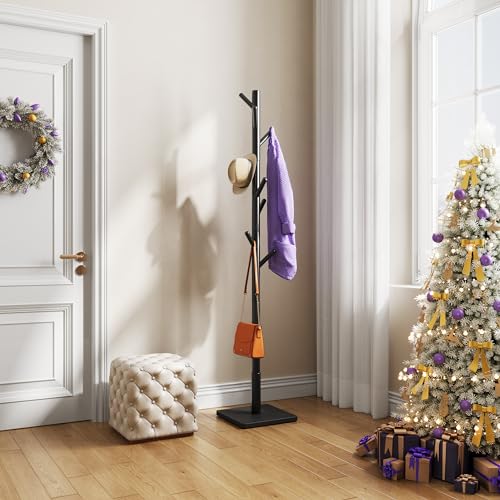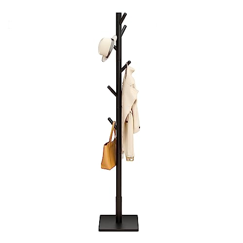 JOISCOPE - جويسكوب حامل معطف بقاعدة مربعة شجرة خشبية قاعة قائمة بذاتها مع 3 خيارات ارتفاع و8 خطافات ملابس للمعاطف والقبعات وشنطة اليد والمظلة للمنزل والمكتب اسود معدن