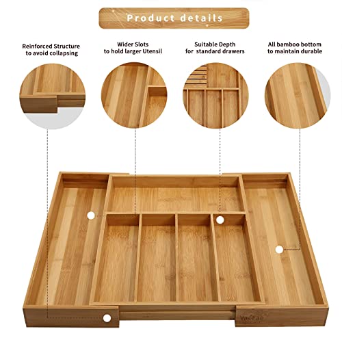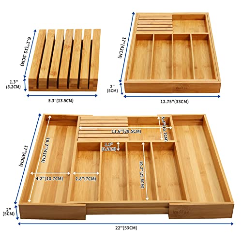 Joleritc - منظم ادراج ادوات المطبخ الفضية من الخيزران من جوليريتك، حامل ادوات مائدة قابل للتوسيع وصينية ادوات تناول الطعام مع مقسم | 13 انش - 21.6 انش لتخزين ادوات المائدة وكتلة سكاكين قابلة للازالة، خشب