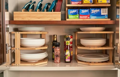 - منظم زوايا متعدد الاستخدامات: مثالي كمنظم خزانة زاوية أو عرض على سطح الطاولة أو رف المؤن، يعمل منظم الخيزران هذا في مناطق مختلفة من منزلك. استخدمه كرف منظم أطباق للخزائن، أو مكدس أطباق للمساحات الضيقة، أو حتى كرف زاوية من الخيزران في حمامك لمزيد من التنوع