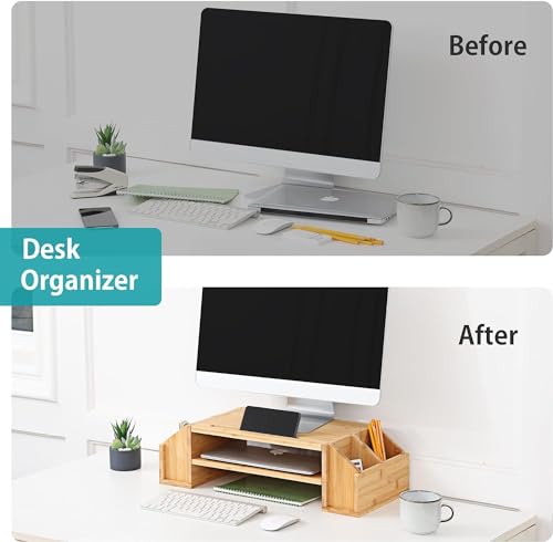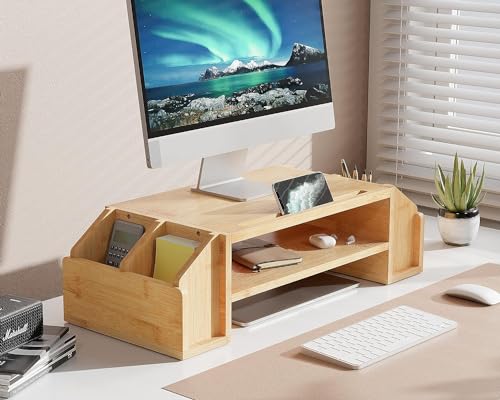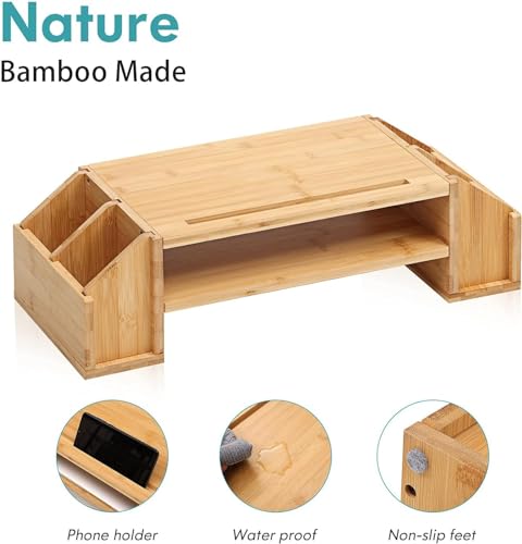Jolfay - حامل شاشة مصنوع من الخيزران بـ 2 مستوى للكمبيوتر واللاب توب مع 4 فتحات تخزين، حامل موبايل، منظم ملحقات مكتب منزلي يناسب الكمبيوتر والطابعة والنوت بوك وبلاي ستيشن 4 من جولفاي