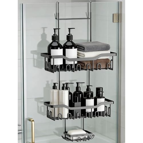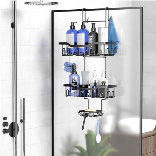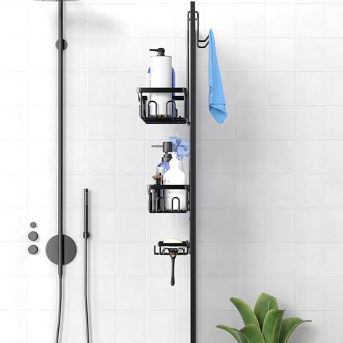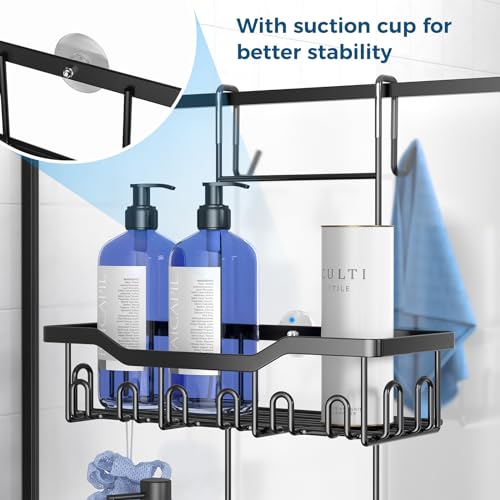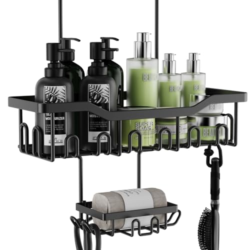 JOLY FANG - رف دش للتعليق من جولي فانج بدون ثقب مع طبق صابون خطافات متعددة سلة منظم حمام معلق اسود