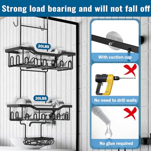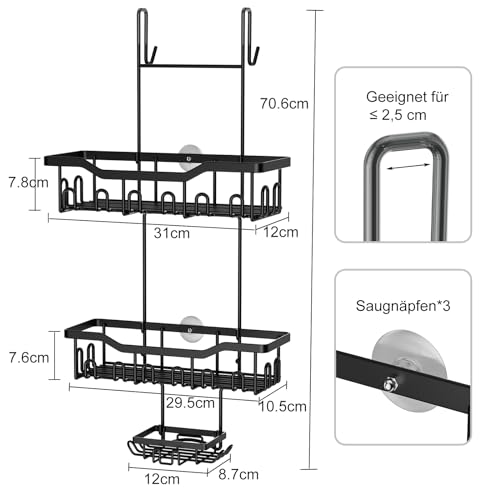 - سعة كبيرة: يوفر رف الدش المعلق مساحة تخزين كبيرة جدًا: 2 × سلال تخزين بتصميم خطاف، 1 × سلة صابون. يمكن لسلة الاستحمام تخزين الشامبو وجل الاستحمام والمناشف وكرات الاستحمام الفوارة وشفرات الحلاقة - مثالية لجميع مستلزمات الاستحمام.