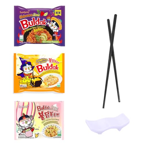 JONEX SCO - مجموعة بولداك رامين هابانيرو لايم، جبنة كواترو، كاربونارا كريم مع عيدان طعام ميلامين قابلة لإعادة الاستخدام من جونيكس سكو وحامل عيدان تناول الطعام من الميلامين