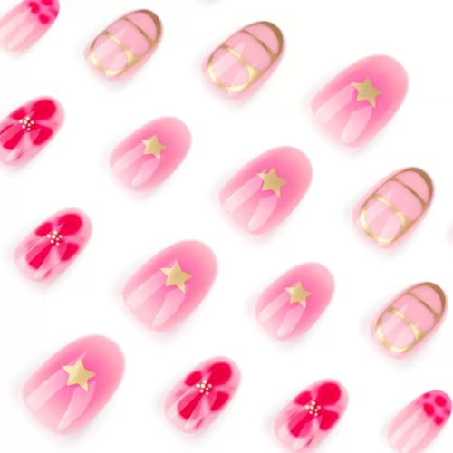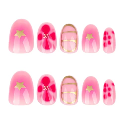 Josquewnn - أظافر صناعية لاصقة مجموعة مكونة من 24 قطعة، بتصميم قصير مستدير مزين بالنجوم والزهور، تصميم فني لطيف للاستخدام اليومي من JOSQUEWNN أظافر اكريليك صناعية مع مجموعة صمغ