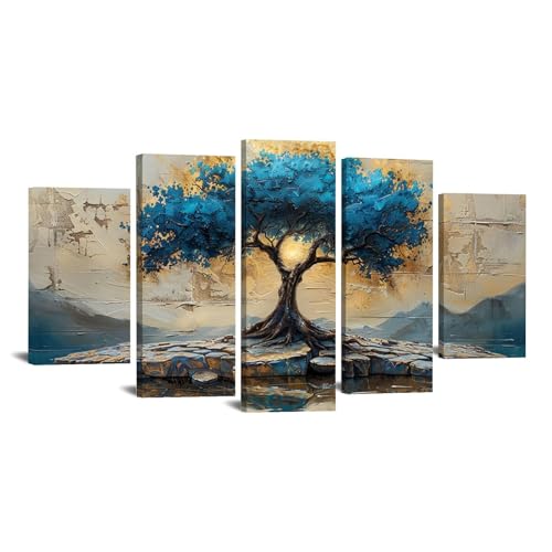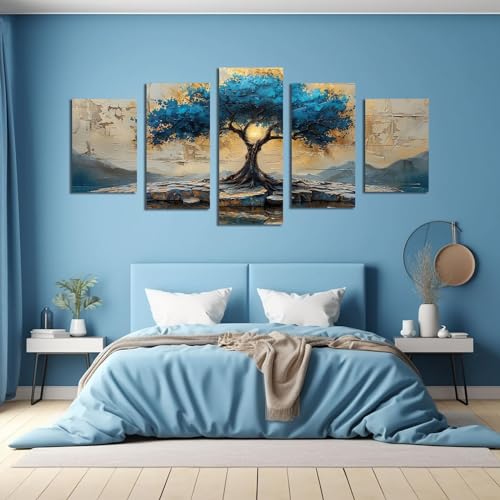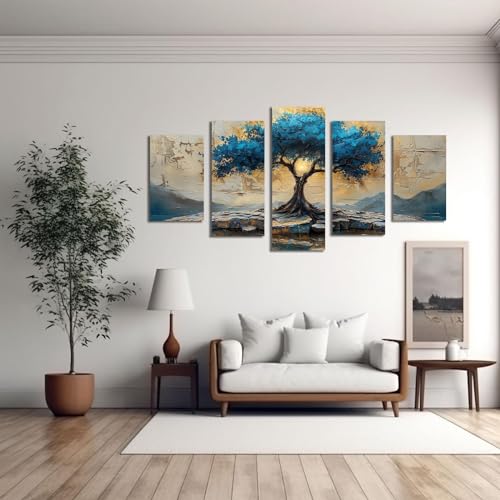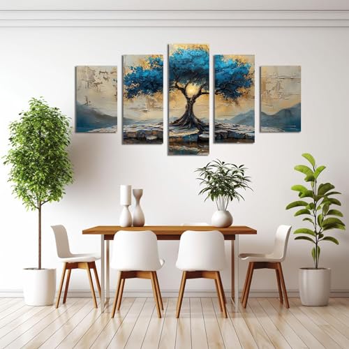 JOSUE - لوحة فنية تجريدية بتصميم شجرة الحياة بلون ازرق من 5 قطع من جوسو، لوحة فنية للديكور الداخلي، لوحة فنية بلون ازرق، لوحة فنية للحائط