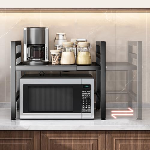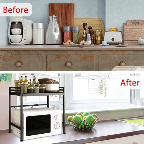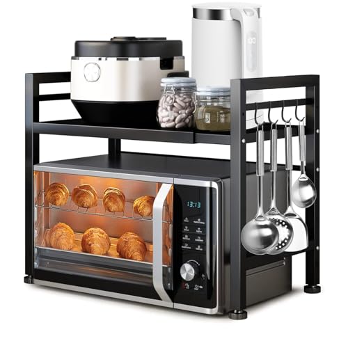 JOYART - رف فرن ميكروويف قابل للتوسيع من جويارت حامل طبقتين خباز المطبخ الستيل الكربوني منظم منضدة مع 8 خطافات حمولة ثقيلة 55 باوند عرض 44-60 سم اسود صلب كربون