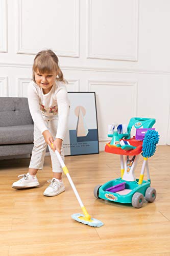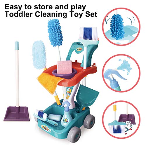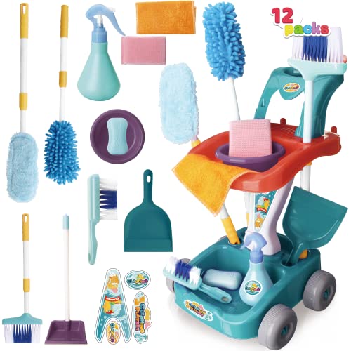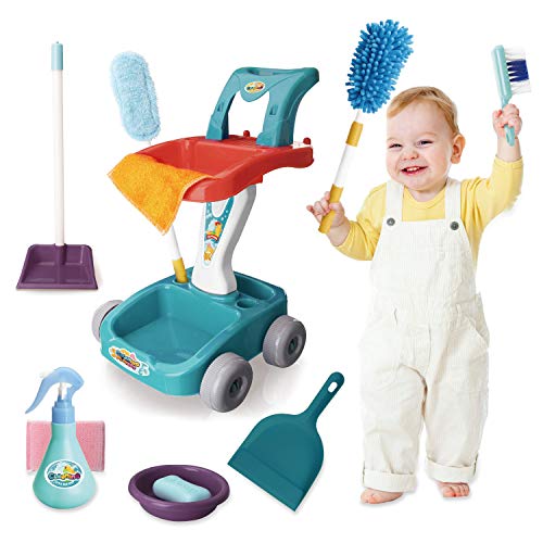 JOYIN - مجموعة تنظيف للأطفال مكونة من 12 قطعة من جويين، عربة لعب للتنظيف المنزلي مع مكنسة، وممسحة، وزجاجة رذاذ وأكثر من ذلك، لعب أدوات التنظيف للأطفال الصغار من سن 1 إلى 3، هدايا حفلات عيد الميلاد والكريسماس