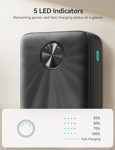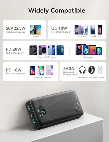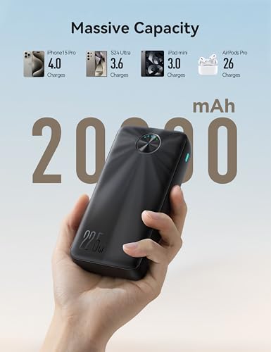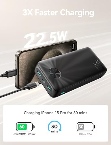 Joyroom - شاحن باور بانك JR-PBF16 بسعة 20000 مللي امبير في الساعة، شحن سريع بقوة 22.5 واط، مؤشر ليد، 3 منافذ (2 USB-A و1 USB-C) من جوي روم، أسود