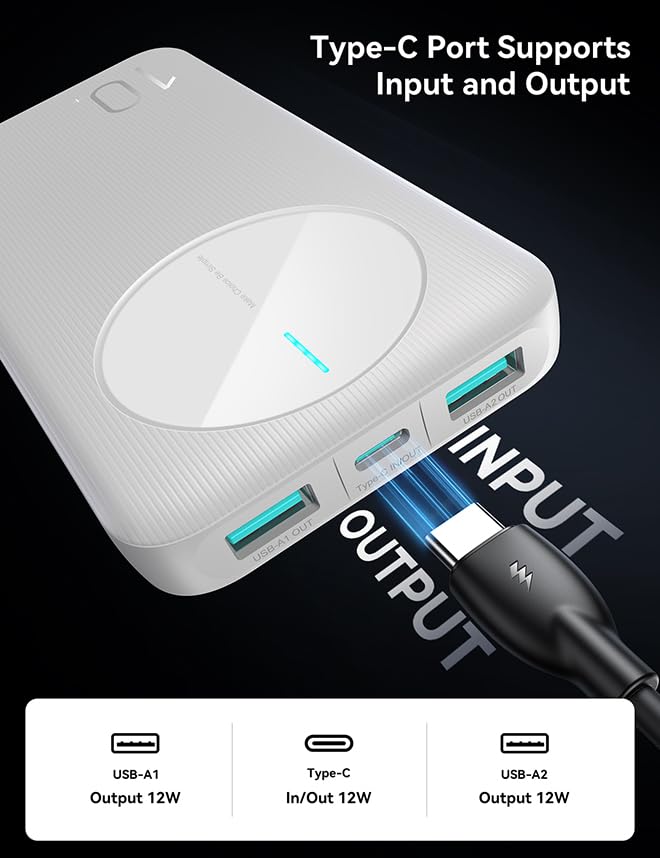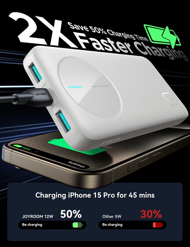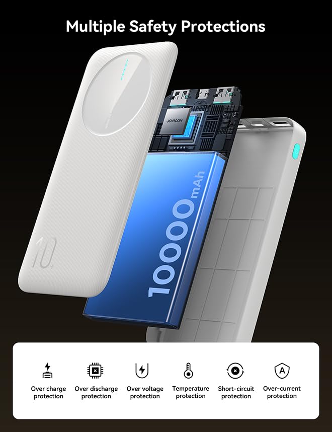 Joyroom - شاحن باور بانك JR-PBF12 بقوة 10000 ميلي امبير في الساعة مع شحن سريع 22.5 وات ومخرج 2.4 امبير و3 منافذ (2 USB-A و1 USB-C) ومؤشر ليد من جوي رووم، أبيض