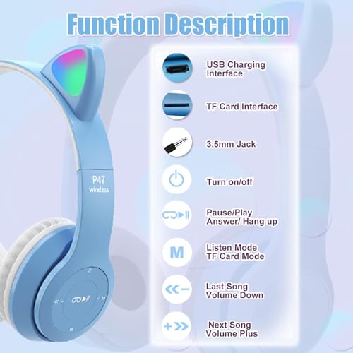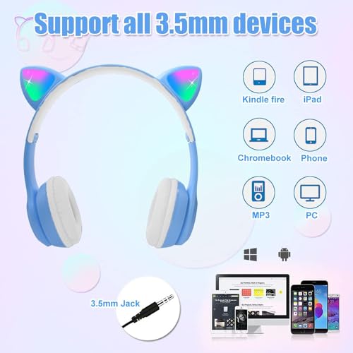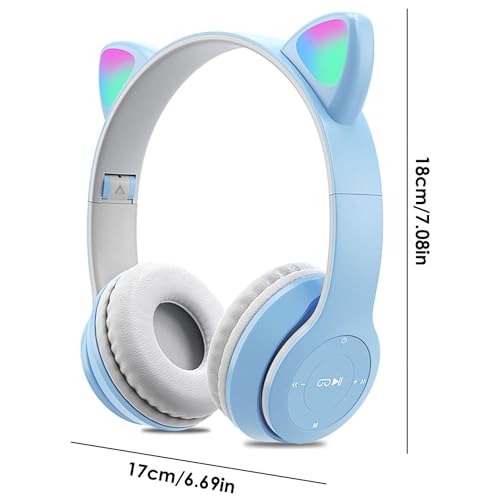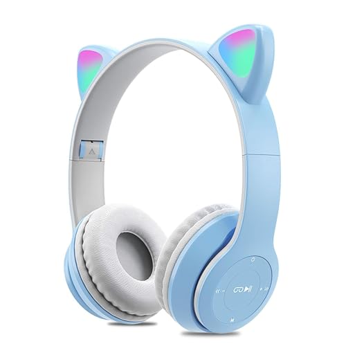 Joyzzz - سماعة رأس لاسلكية بلوتوث 5.0 بتصميم أذن قطة للأطفال بإضاءة ليد مع ميكروفون وأذنين، سماعات أذن شكل قطة قابلة للطي للهواتف الذكية والكمبيوتر والتابلت من جويز (لون أزرق)