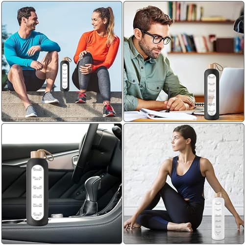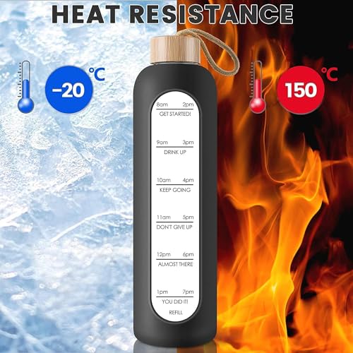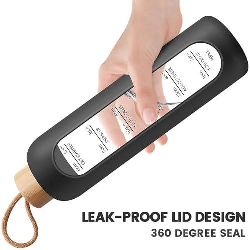 Joyzzz - زجاجة مياه تحفيزية من زجاج بوروسيليكات من جويزز، سعة 1.000 لتر مع علامات للوقت، مانعة للتسرب وخالية من مادة بيسفينول أ مع حافظة سيليكون وغطاء من الخيزران للاستخدام الخارجي وممارسة الرياضة (أسود)
