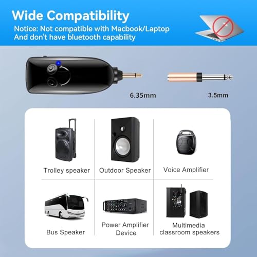 - 🎁 【توافق واسع】يمكن استخدام الميكروفون اللاسلكي بتقنية التردد العالي جدًا مع مضخّمات الصوت، السماعات عالية القدرة، أنظمة مكبرات صوت محمول/أجهزة المزج (مع مدخل ميكروفون 6.35 مم)، وأنظمة مكبرات الصوت الخاصة بالكاراوكي. نوفر أيضًا محوّلات من 3.5 مم إلى 6.35 مم لمنحك مرونة أكبر وخيارات أوسع. (كمبيوتر بدون تعزيز الصوت)