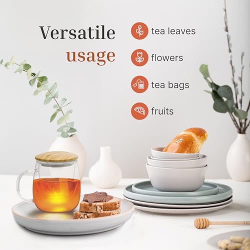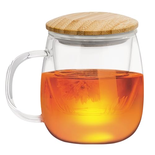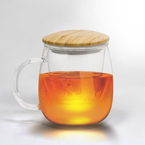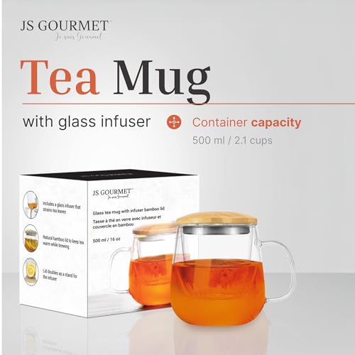 JS Gourmet - كوب شاي زجاجي سعة 17 اونصة (500 مل) مع مصفاة وغطاء من الخيزران، كوب شفاف مع مصفاة لاوراق الشجر السائبة والشاي المزهر واكياس الشاي ونقع الشاي من جيه اس جورميه