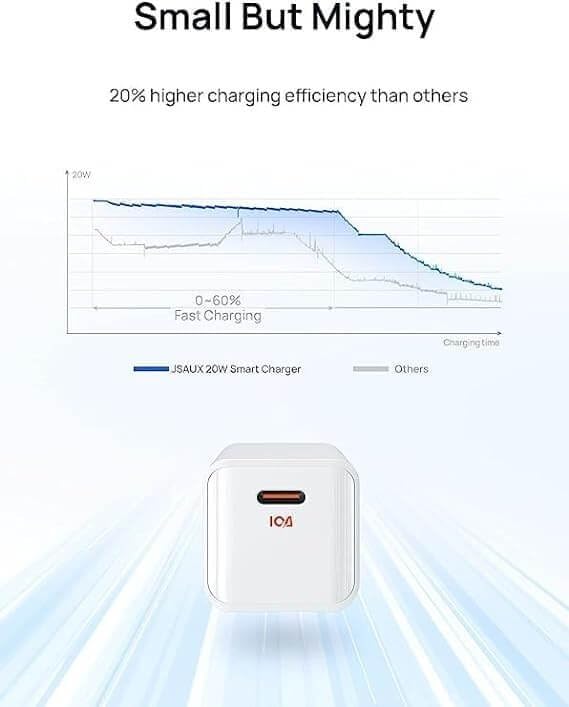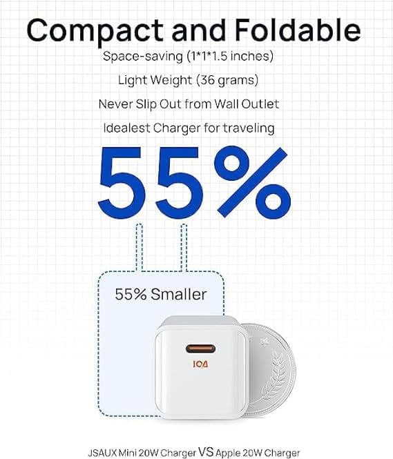 JSAUX. - شاحن نانو CH2006 20 واط USB نوع سي من جيه سوكس، منفذ مزدوج 20 واط + محول حائط سريع الشحن كيو سي، تصميم صغير لاجهزة ايفون وسامسونج والتابلت وغيرها - ابيض