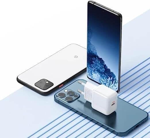 - شاحن مزدوج المنفذ مع دعم شحن سريع 20 واط بي دي وتقنية كيو سي.