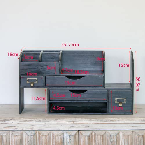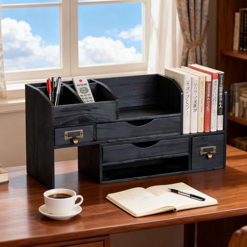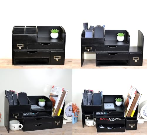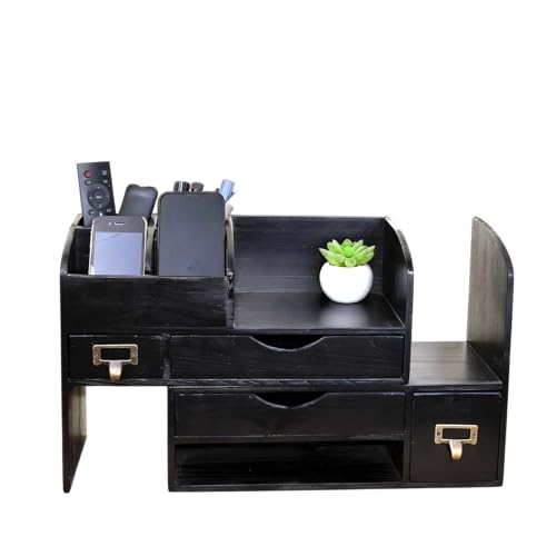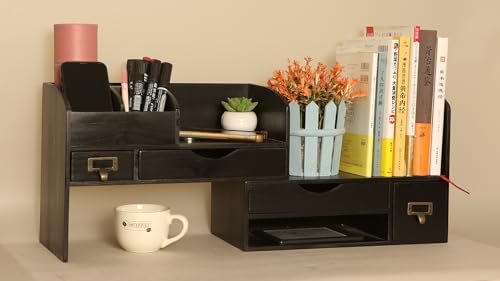 Juleduo - منظم مكتبي، رف خشبي تلسكوبي للكتب ومستحضرات التجميل، رف لسطح المكتب وجهاز التحكم عن بعد (أسود) من جوليديو
