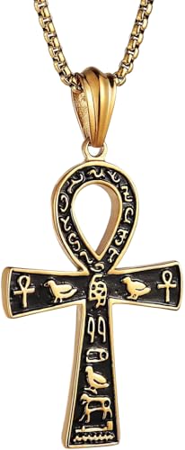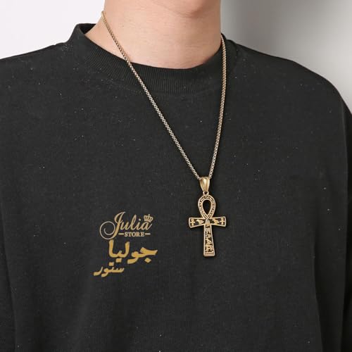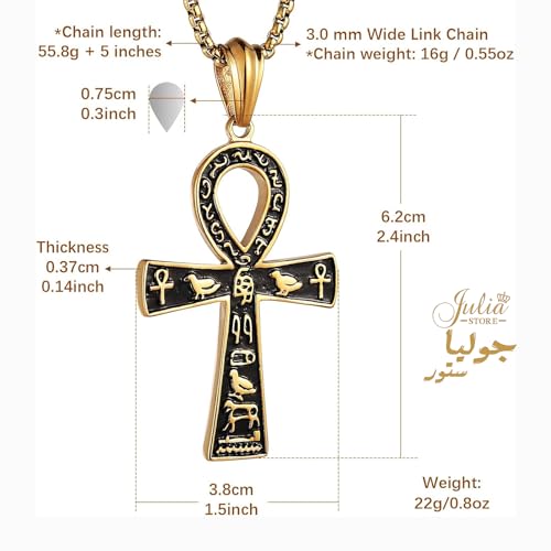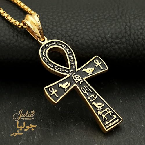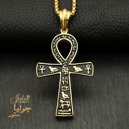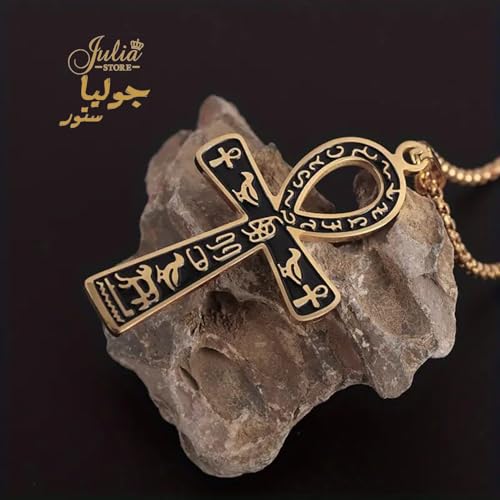Julia Store - قلادة فرعون من الفولاذ المقاوم للصدأ المطلي بالذهب عيار 18 قيراط، مجوهرات مفتاح الحياة في مصر القديمة، مطلية بالمينا الهيروغليفية الكبيرة، مع سلسلة 60 سم، للنساء والرجال من جوليا ستور