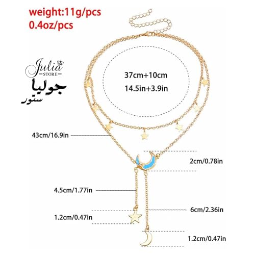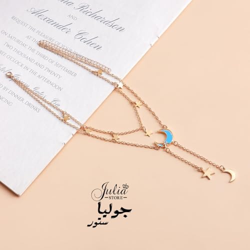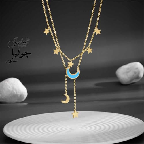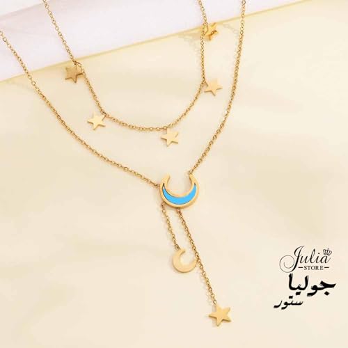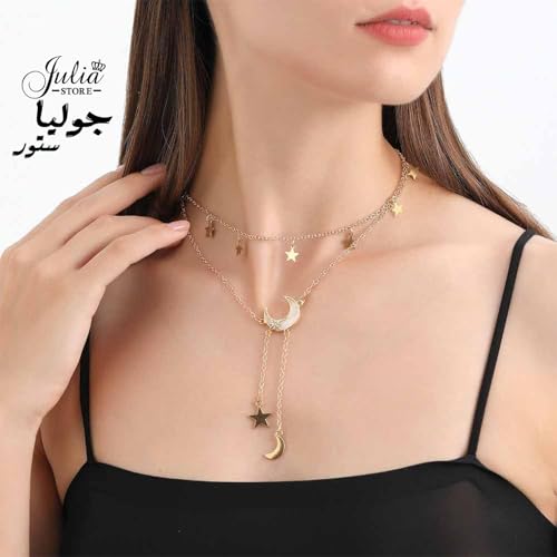 Julia Store - قلادة من الستانلس ستيل المطلي بالذهب عيار 18 قيراط من جوليا ستور، قلادة على شكل قمر ونجمة وقمر وشرابة مرصعة باحجار الراين، قلادة بدلاية على شكل هلال