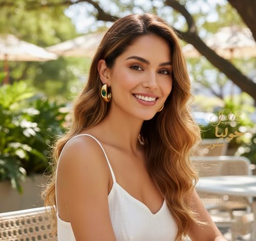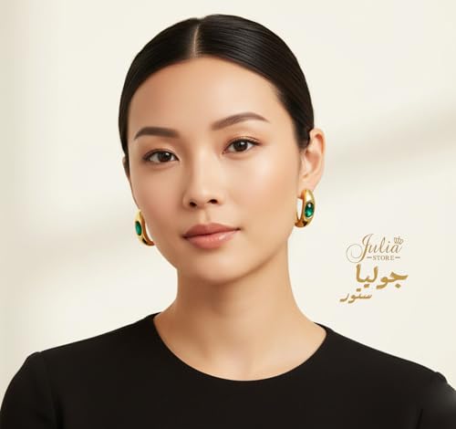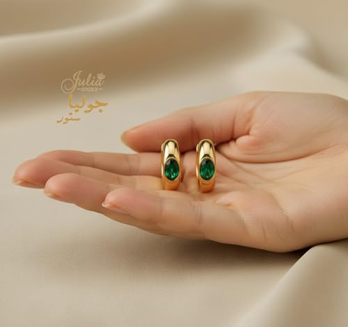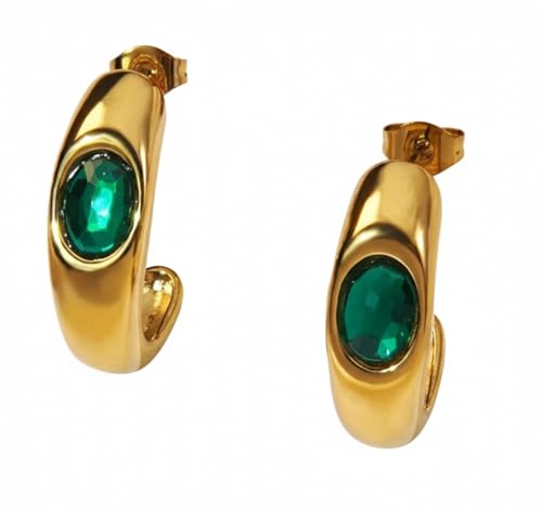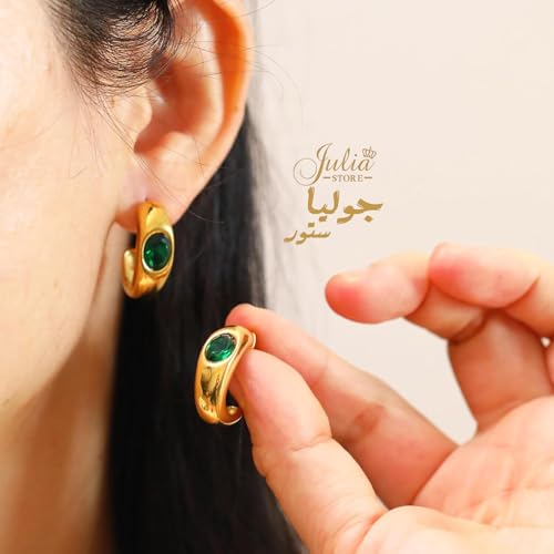 Julia Store - اقراط بريمة من الستانلس ستيل المطلي بالذهب عيار 18 قيراط على شكل حرف C مرصعة بحجر الراين والزركون الاخضر المقلد للنساء من جوليا ستور، اقراط مرصعة بالزركونيا المكعب، اقراط تجميلية، هدية مجوهرات عصرية