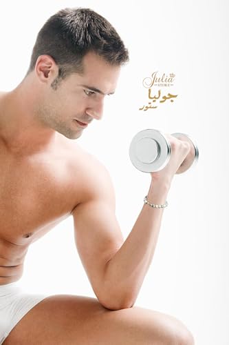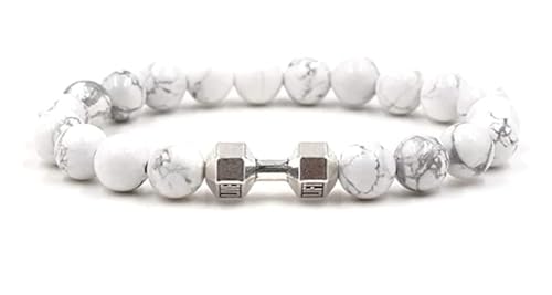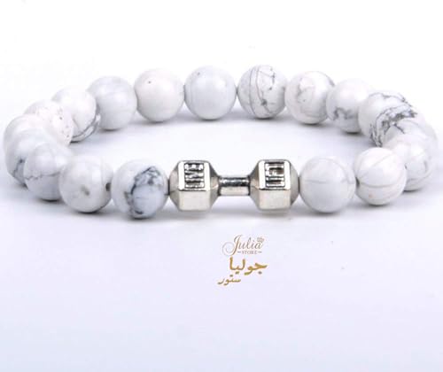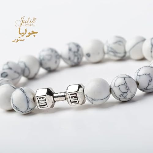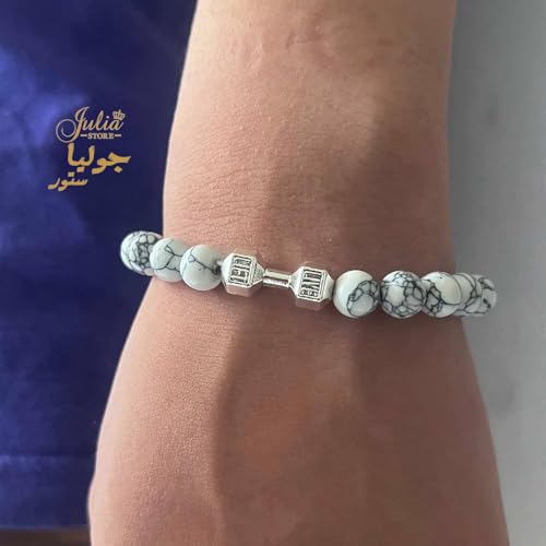 Julia Store - سوار دمبل ابيض مصنوع يدويا من جوليا ستور، لياقة بدنية للياقة البدنية، خرز بركاني طبيعي قابل للتعديل، مجوهرات للرجال