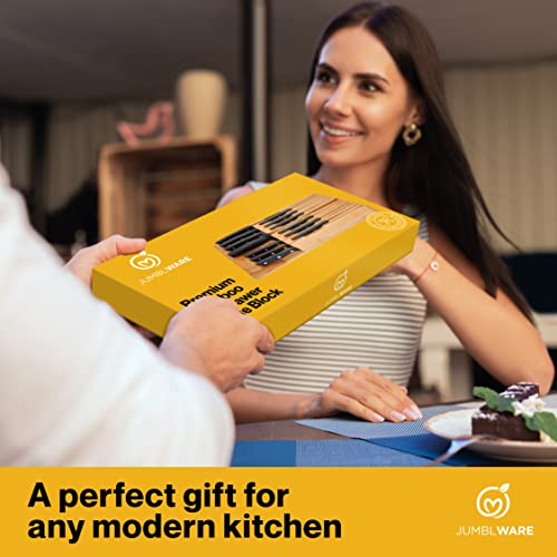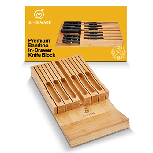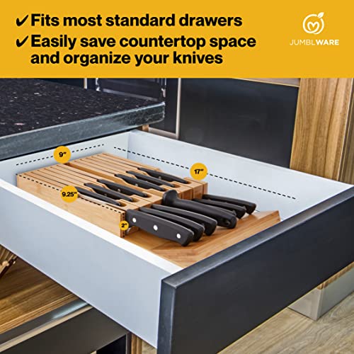 JumblWare - منظم سكاكين وحامل أدوات مائدة خشبي من البامبو للأدراج الداخلية والدولاب والمنضدة بقاعدة شاملة تناسب 16 سكينًا ومسن للمطبخ من جامبلوير