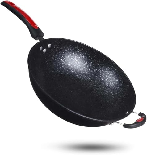 Generic - طاسة ووك غويطة وكبيرة مقاومة للالتصاق مقاس 34 سم - صلب كربوني متين مع طلاء تفلون للطهي للعائلة والقلي العميق وتحضير الخضار السوتيه والشاورما والسجق والبانيه - أواني طهي كبيرة متعددة الأغراض للمطبخ
