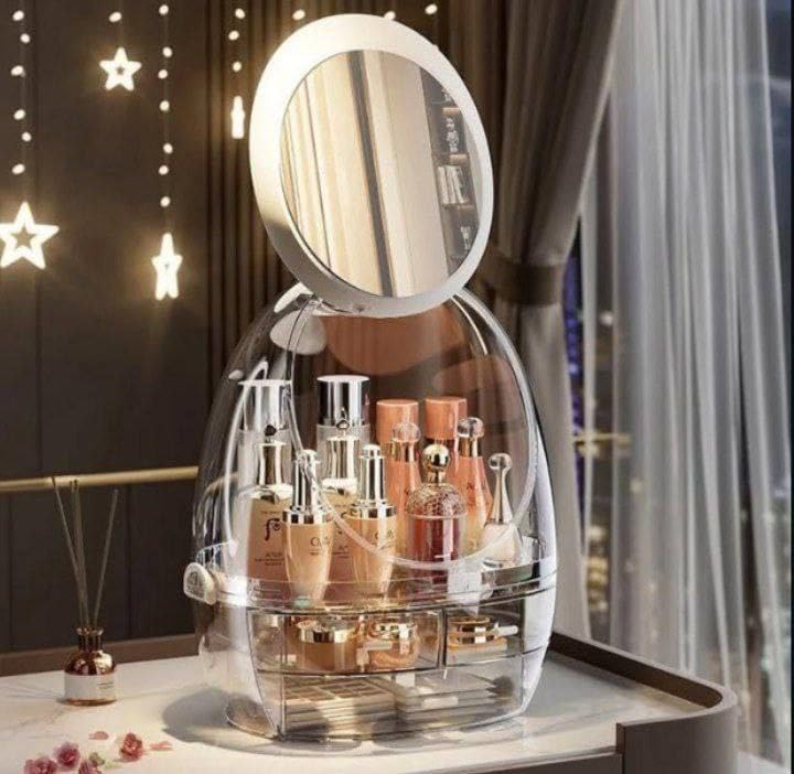 - خامة أكريليك كريستال بيور: متينة وشفافة تمنحك شكلًا أنيقًا وسهل التنظيف. مراية دوارة عملية: تتيح رؤية كاملة أثناء وضع المكياج أو ترتيب الإكسسوارات. 3 أدراج واسعة: لتخزين الميكب والعطور والمجوهرات بشكل منظم. تصميم متعدد الاستخدامات: مناسب للميكب أو الإكسسوارات أو أدوات العناية الشخصية. شكل عصري أنيق: يضيف لمسة ديكور فخمة لأي غرفة أو مكتب تجميل.