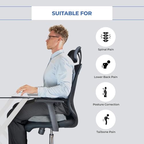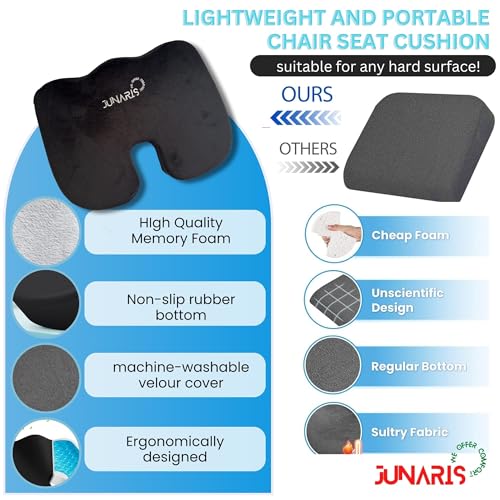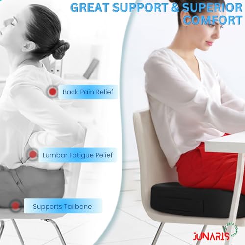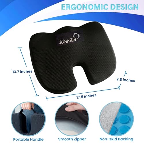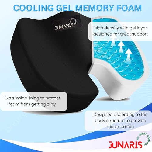 JUNARIS - وسادة مقعد معززة من الجل من جوناريس - وسادة العصعص لتقويم العظام غير قابلة للانزلاق من جل ميموري فوم لالام عظم العصعص - وسادة كرسي المكتب ومقعد السيارة - لتخفيف الام عرق النسا والظهر (اسود)
