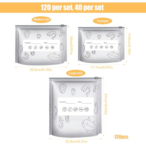 - 1. عبوة من 120 كيس فريزر في 3 مقاسات (S، M، L). تحتوي مجموعة أكياس الفريزر القابلة لإعادة الاستخدام هذه على 120 قطعة بثلاثة أحجام شائعة: 40 × صغير (13 × 18 سم)، 40 × متوسط (15 × 21 سم) و40 × كبير (27 × 24 سم). مثالية كحقيبة تخزين طعام أو حقيبة تخزين أو حقيبة بسحاب لجميع طعامك