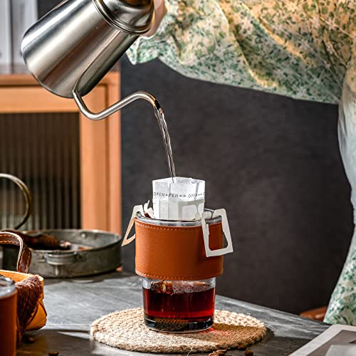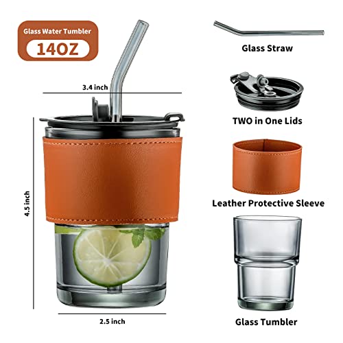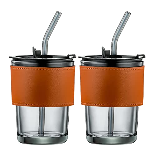 Juosta - كوب ماء زجاجي مع شفاطة وغطاء مع حافظة واقية من الجلد بفتحة واسعة وقابل لإعادة الاستخدام من جوستا، سعة 400 مل مكون من قطعتين بتصميم محمول للسفر مناسب للمشروبات الساخنة والباردة
