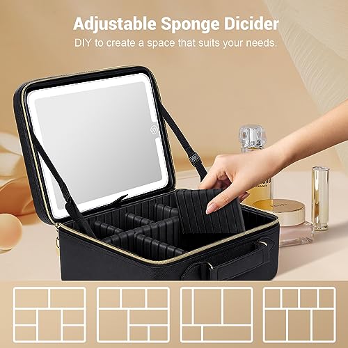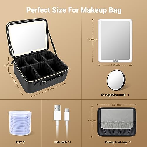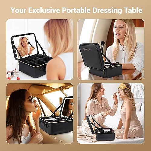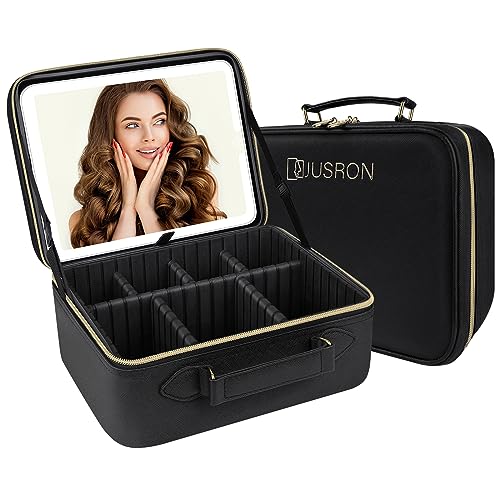 JUSRON - شنطة مكياج للسفر، شنطة منظمة للمكياج مع مراة مضيئة و3 سيناريوهات الوان وسطوع قابل للتعديل، هدية للنساء