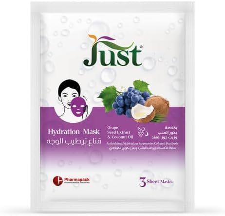 Just - قناع ورقي للوجه للترطيب الفوري، ماسك مضاد للأكسدة ومرطب ويعزز تركيب الكولاجين من جاست، عبوة من 3 أقنعة ورقية
