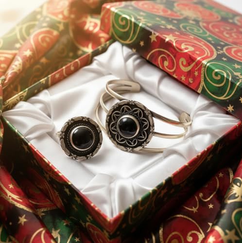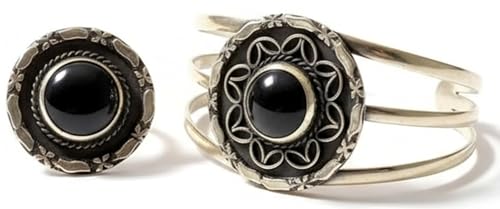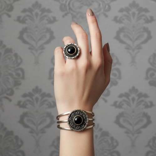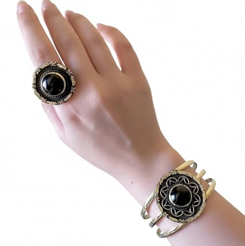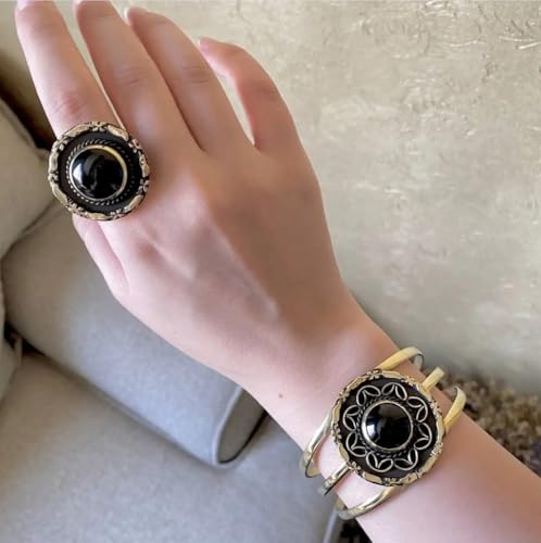 Generic - طقم مجوهرات من النحاس وخاتم مزين بالزهور للنساء من جاست سالما، سوار عريض بنمط عتيق وخاتم قابل للتعديل، مجموعة من قطعتين محفورة مع حجر اسود، هدية انيقة