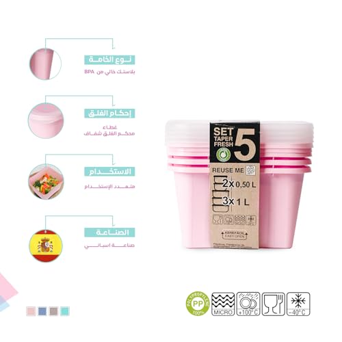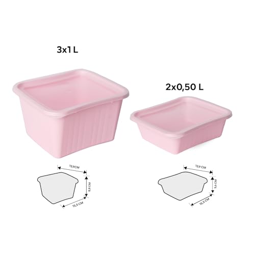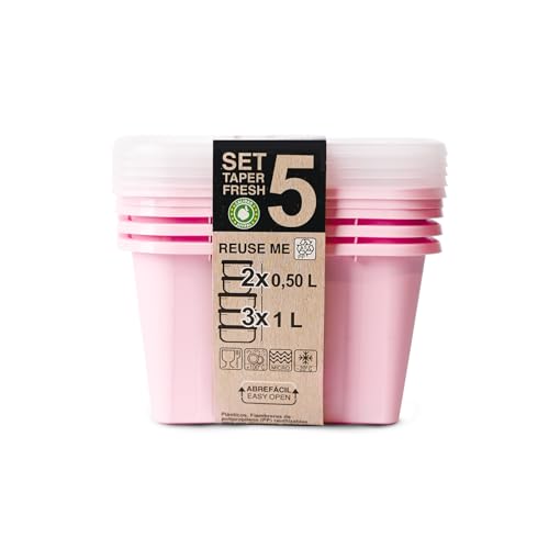 Juypal Hogar - طقم عبوات تخزين طعام عبارة عن غاز 5 قطع (3×1 لتر + 2×0.5 لتر) من بلاستيك خالٍ من بيسفينول أ وآمن للاستخدام في الميكروويف والمجمد وغسالة الأطباق بأغطية سهلة الفتح من خويمبال، وردي ناعم، صنع في إسبانيا