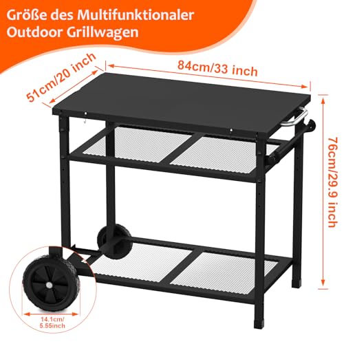 - عربة شواء متعددة الوظائف للاستخدام في الهواء الطلق، عربة الشواء متعددة الوظائف هذه هي الخيار الأمثل للطهي في الهواء الطلق. يمكن استخدام سطح الطاولة الكبير كطاولة فرن للبيتزا، لذلك يمكنك بسهولة شواء مجموعة متنوعة من الأطعمة اللذيذة. بالإضافة إلى ذلك، يمكن استخدامه أيضًا كطاولة طعام خارجية ومنضدة عمل للحديقة وحامل أدوات. سواء كنت تطبخ في الهواء الطلق أو تستضيف التجمعات العائلية أو تعمل في الحديقة يوميًا، فهي مثالية.