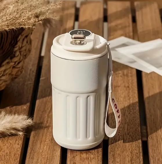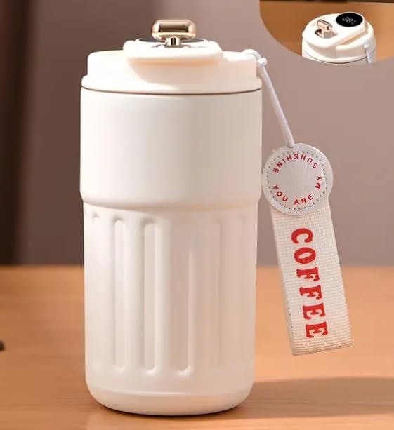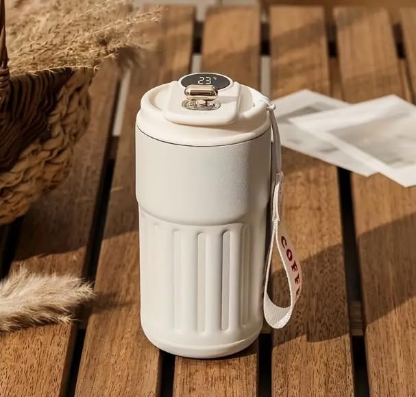 K.H - مج قهوة سفر معزول من الفولاذ المقاوم للصدأ عزل حراري بتفريغ الهواء مقاوم للتسرب مع شاشة عرض درجة الحرارة سهل التنظيف من كيه اتش، لون كريمي، سعة 460 مل، قطعة واحدة