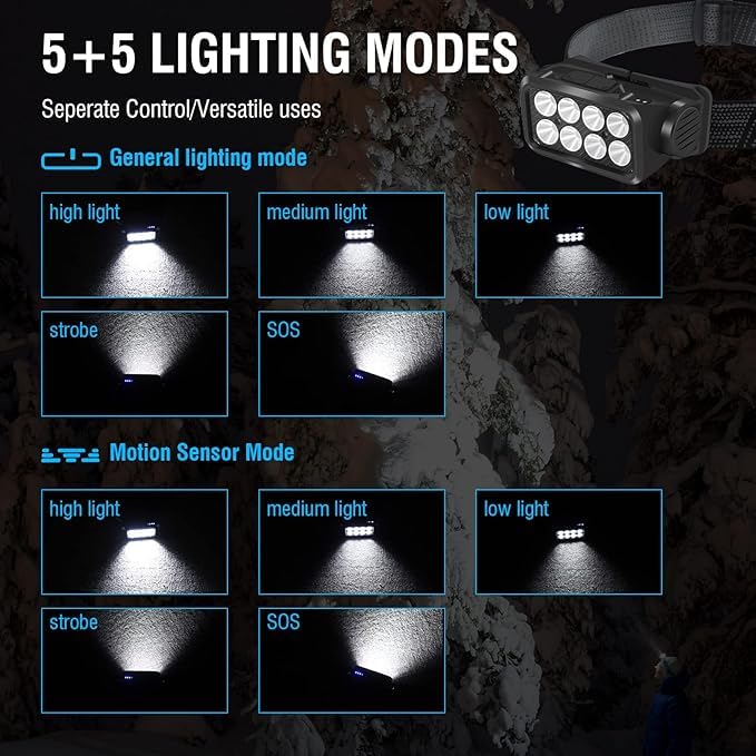 - مصباح رأس بمستشعر ذكي ➤➤ تحتوي مصابيح الرأس للجبهة على 5 أوضاع إضاءة (عالية/متوسطة/منخفضة/وامضة/طوارئ)، مناسبة لاحتياجاتك في ظروف مختلفة. إضافة وظيفة مستشعر الحركة، يمكن تشغيل/إيقاف تشغيل مصباح الرأس المقاوم للماء IPX4 في حدود 15 سم عن طريق التلويح بيدك، وهو أكثر ملاءمة.
