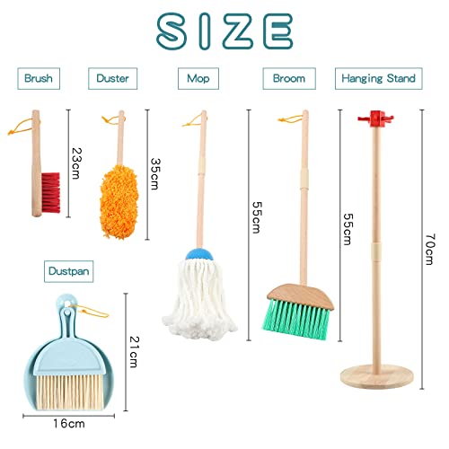 - 【ألعاب تنظيف خشبية】تتضمن ألعاب التنظيف الخشبية مكنسة وجاروف وفرشاة ومنفضة وفرشاة يد ومساحة موب وحامل تعليق.