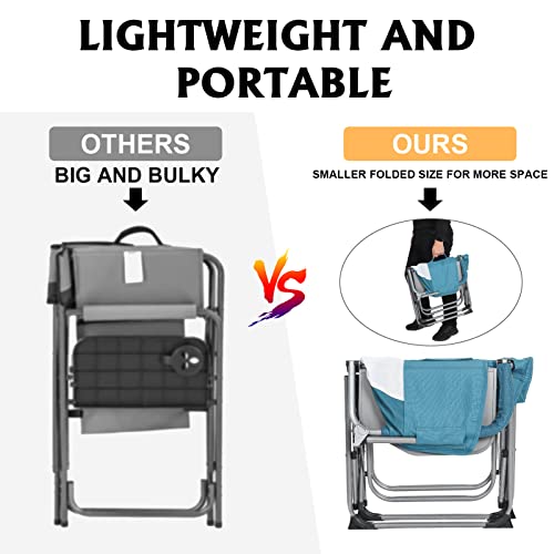- هيكل فاخر: إطار الكرسي القابل للطي هذا مصنوع من دعامات أنبوبية فولاذية مطلية بالمسحوق، والتي يمكن أن تدعم ما يصل إلى 300 باوند، وسطح الكرسي مصنوع من قماش أكسفورد ونسيج شبكي جيد التهوية، وهو قوي وجيد التهوية ومقاوم للتآكل. يزن كرسينا القابل للطي 9 باوند فقط، وهو أخف من كراسي التخييم الأخرى أو كراسي المديرين، سهل الحمل والتحريك.