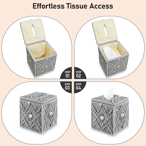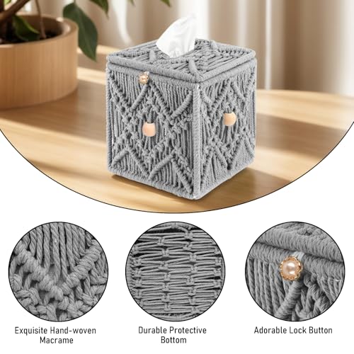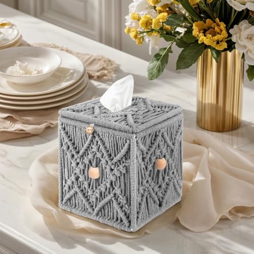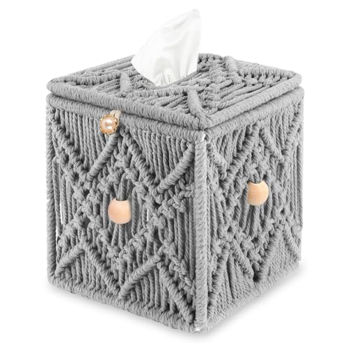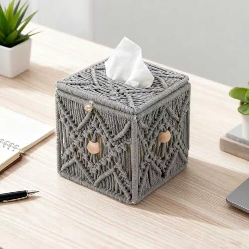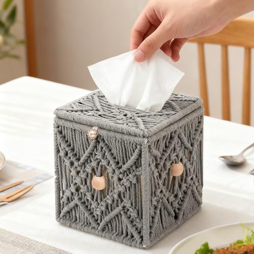 KaloKalo - غطاء علبة مناديل مصنوع يدويا من كالوكالو، حامل مناديل بوهو مربع مزخرف بحبل قطن منسوج، منظم مناديل الوجه، علبة تخزين مكتب بوهيمية مع مشبك خرز خشب (رمادي)