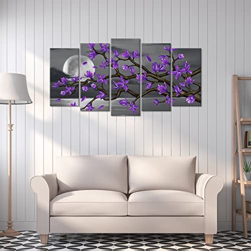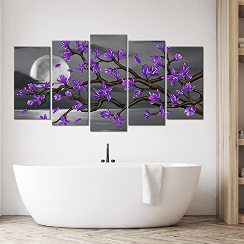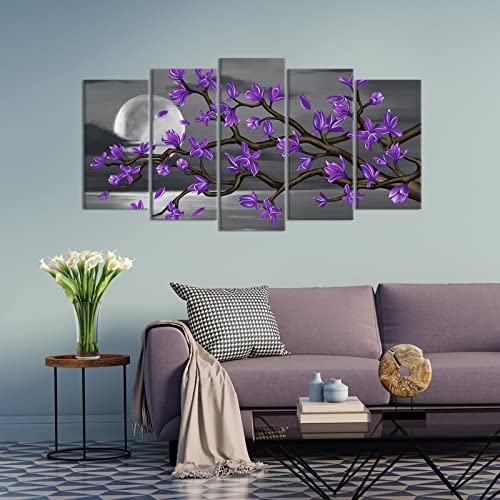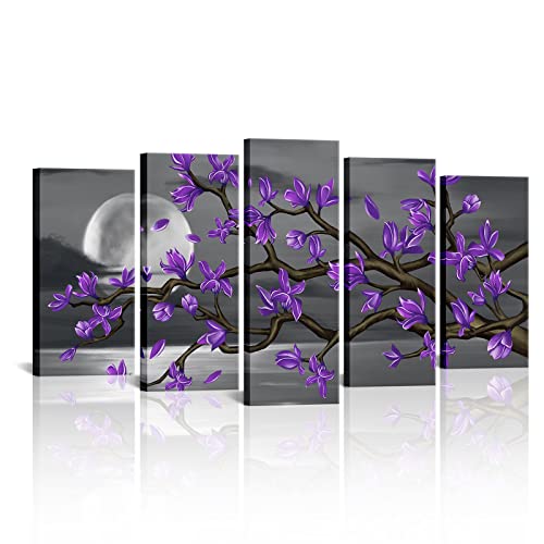 Kalormore - لوحة زهور أرجوانية على شكل قمر أبيض وأسود مع صورة زهور ماغنوليا من كالورمور، لوحة فنية جدارية قماشية لغرفة المعيشة وغرفة النوم والحمام جاهزة للتعليق (طول 60 × ارتفاع 32 سم)