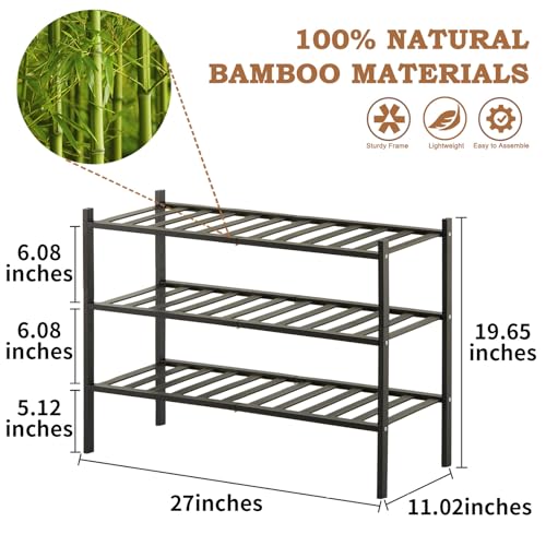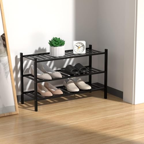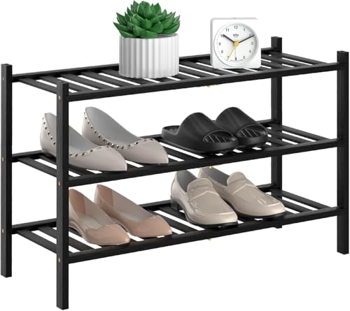 Kameety - رف أحذية خشبي قائم بذاته من الخيزران، منظم تخزين للمدخل، مساحة صغيرة قابلة للتكديس من كاميتي، 3 طبقات (أسود)