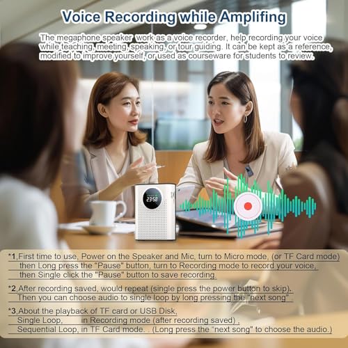 - 【تسجيل الصوت أثناء التضخيم】يدعم مضخم الصوت الشخصي هذا تسجيل الصوت المتزامن أثناء التضخيم. مكبر الصوت للمعلمين ليس فقط لمساعدتهم على تخفيف العبء على حناجرهم، بل أيضًا كمسجل صوت لتسجيل محتوى المحاضرات والاجتماعات والخطب. من المريح التحقق من أوجه القصور في التحسين والتحقق منها، كما يمكن الاحتفاظ بها لإعادة التدريس للطلاب. (*تأكد من صوت واحد أو أكثر في المجلدات الرئيسية لبطاقة تي اف أو قرص USB!)